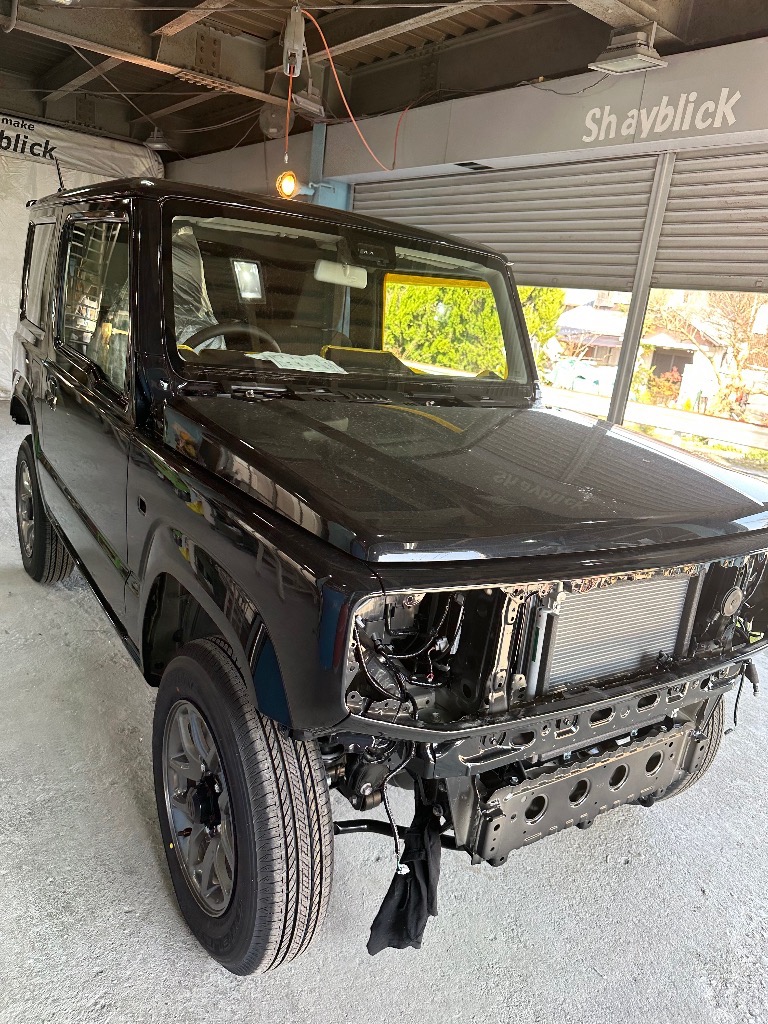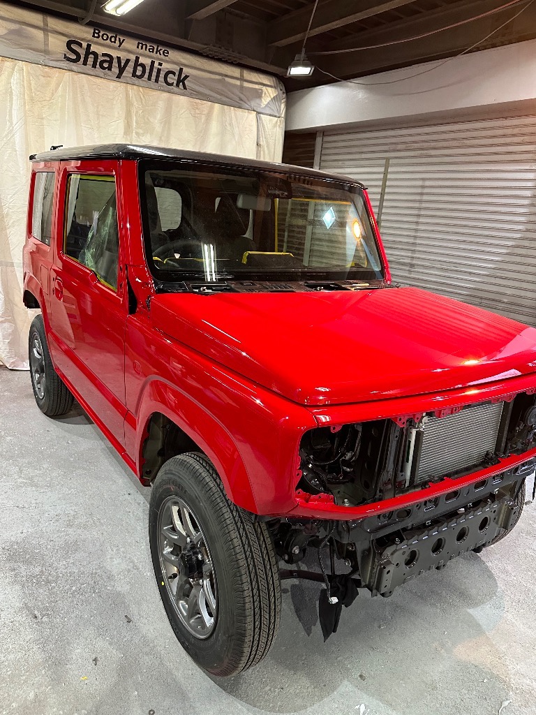 新車のジムニー黒色の車両に純正色ではないマツダカラーのSU クラシックレッドにオールペイントしました。天井は純正カラーを生かしてそのままに!かっこよく仕上がりました!